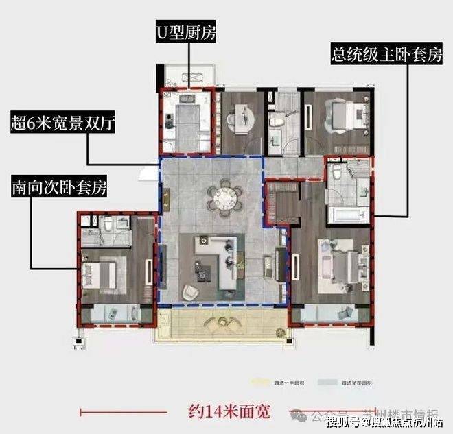 从尺度上看,约14米南向面宽、超6米的南向阳台,搭配全景落地窗打造无界视野;超4.2米的宽景主卧,步入式衣帽间+豪华卫浴,打造奢华居住体验。
