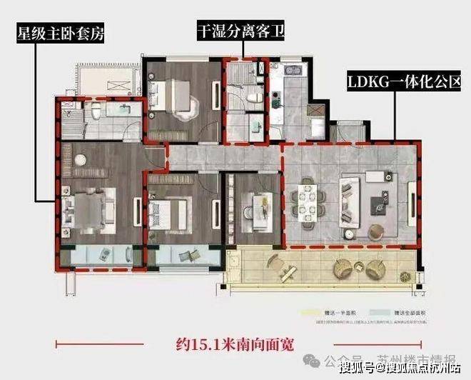 南向约15.1米的超大面宽,做到了罕见的5开间朝南,给人一种墅级产品的尺度感。