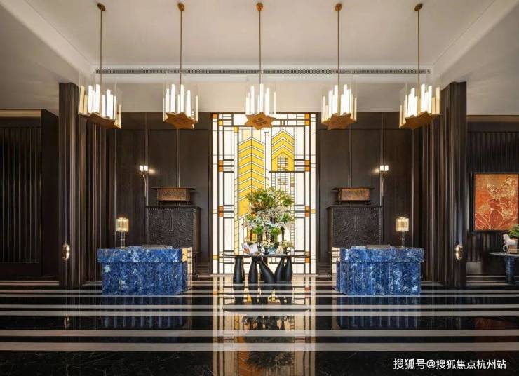 细节之处,光是一个接待台,就采用了产自玻利维亚约4500米海拔的高原矿脉——玻利维亚蓝石材,是世界上储存量最少的石材之一,非常珍贵;而大堂的柱子,也是巴西乌金奢石;