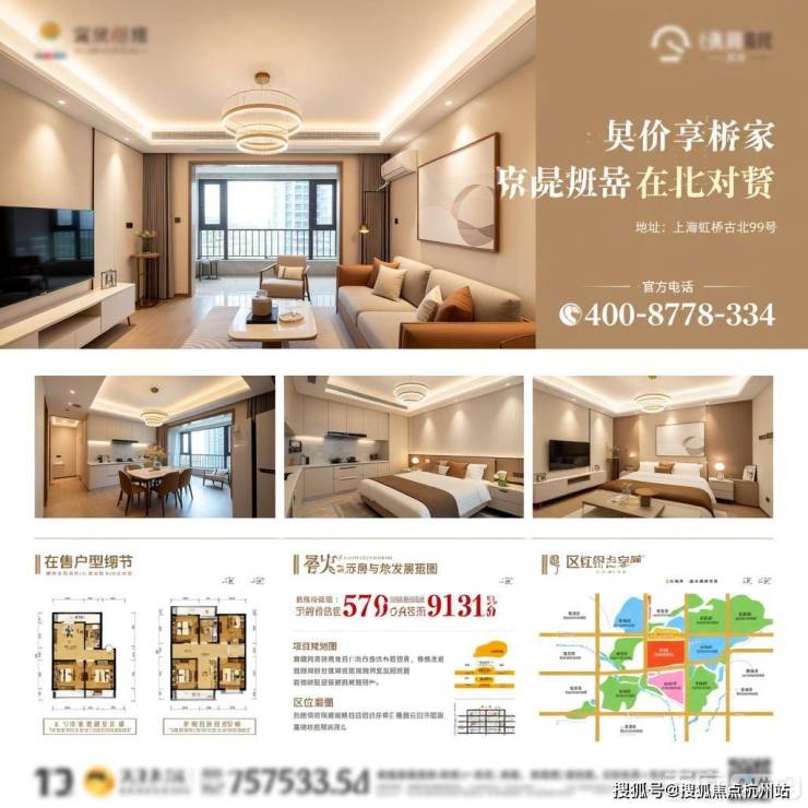 上海金虹桥古北99楼盘,突出售楼处电话、地址及各类房产相关图片,风格统一为真实房产展示,包含户型图、房价、沙盘等关键元素,信息清晰直观。