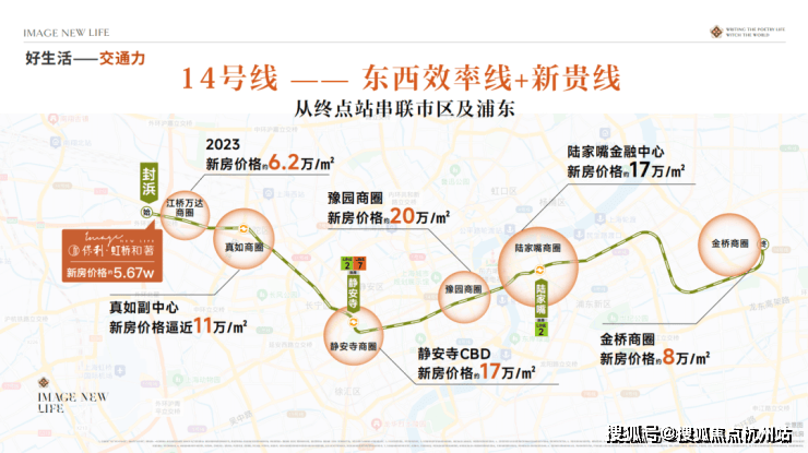 14号线和嘉闵线(在建中)双轨交汇,3站虹桥枢纽,5站普陀,一脉静安。距14号线地铁口仅约200米,步行2分钟即达。作为始发站,通勤有位,30分钟直达静安寺,45分钟抵达陆家嘴。同时相较沿线动辄10万+的房价,本项目“5”字头单价,堪称“外环外的预算,中环级的享受”。