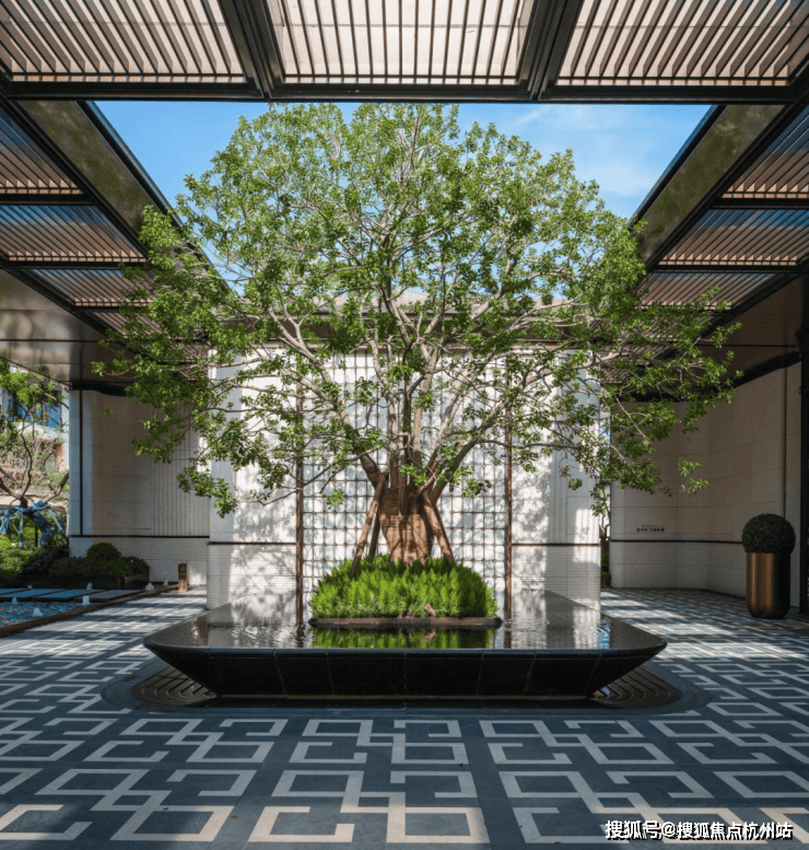 社区入口, 百米酒店式落客门庭、超60年树龄铁冬青打造的“ 大树聚场”、潘多拉发光奢石拼花的 “ 躺平水院”,是家人休憩、邻里小聚的好去处;