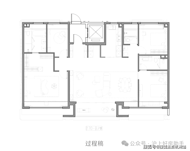 建面约170㎡户型:直接放大招, 五面宽,南向总面宽17.2米,客厅面宽8.2米,主卧面宽5.4米,自带衣帽间、独立收纳空间。 三个套房设计,把豪宅该有的尊崇感安排得明明白白 。