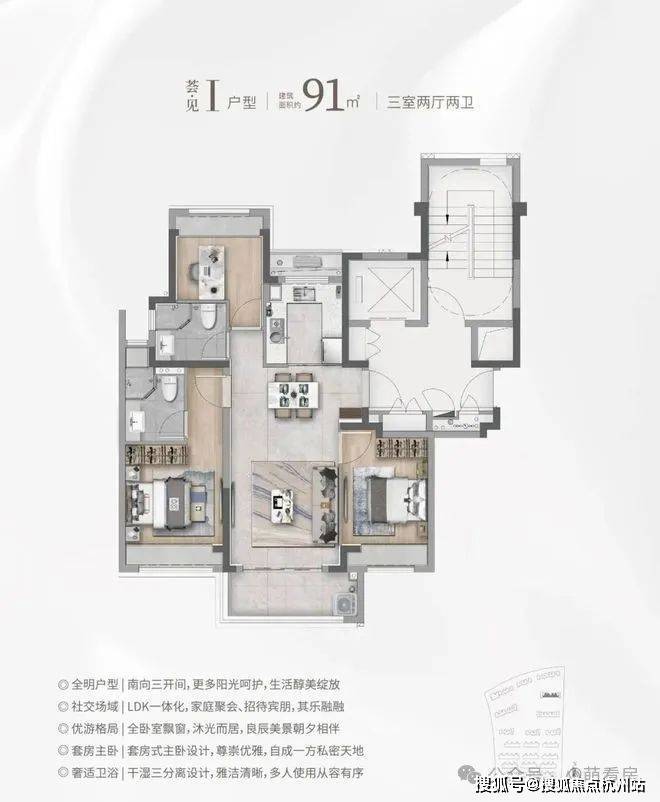 市面上90㎡左右户型两房居多,华发海上都荟建面约91㎡直接3房一步到位,并且有2卫配置,主卧进阶套房,功能性远超同价位竞品!
