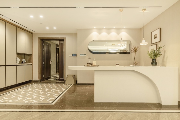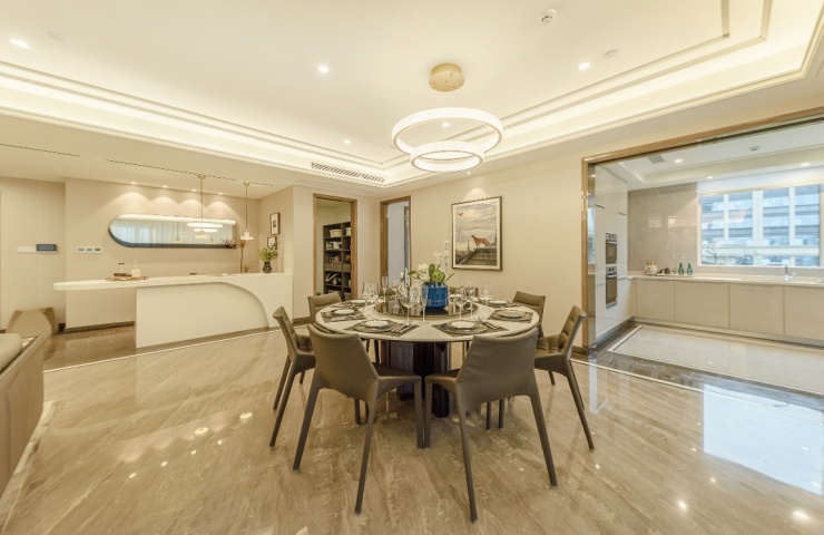 精装上,更显豪宅气度。从唯宝、汉斯格雅、博世等国际百年大牌的严选,到水刀拼花、叠级式吊顶、石材踢脚线等臻于细节的工艺追求,再到菲拉格慕、纳斯拉夫白、圣罗兰大理石的严苛选材和尤加利高光电视景墙的大师高定审美设计,以无处不在的奢华演绎高端生活场,再造豪宅高峰。