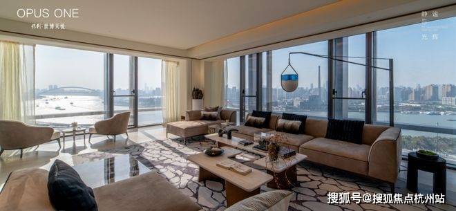 这客厅既是 270°全景舱厅 ,无论全家在餐桌前欢聚一堂,还是孩子们在客厅嬉戏,一抬头便是以江景和城市为主题的巨幅油画。