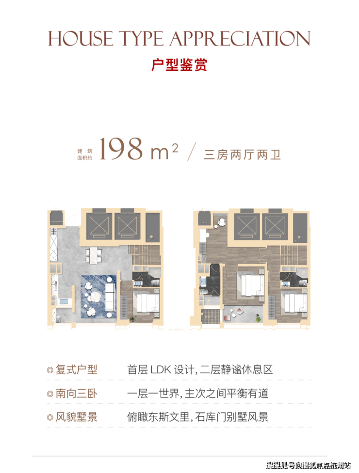 该户型只有极致景观楼层才有,南向景观面达约13.5米,无遮挡,南向两个卧室均有很好的视线通达性.