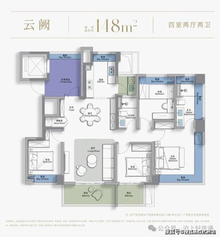 作为改善旗舰户型,建面约148㎡以四房两厅两卫格局,实现四开间朝南极致采光。一梯一户配置打造私享阳光梯厅,兼具收纳与私密。餐客采用LDKB一体化设计,作为“好房子”新规后首发户型,拥有约3.05米层高更显开阔。主卧配备270°环景飘窗(仅5#、10#楼边套),无敌视野,晨起赏朝阳、夜晚观繁星;独立衣帽间与全明双台盆主卫,尽显品质格调。