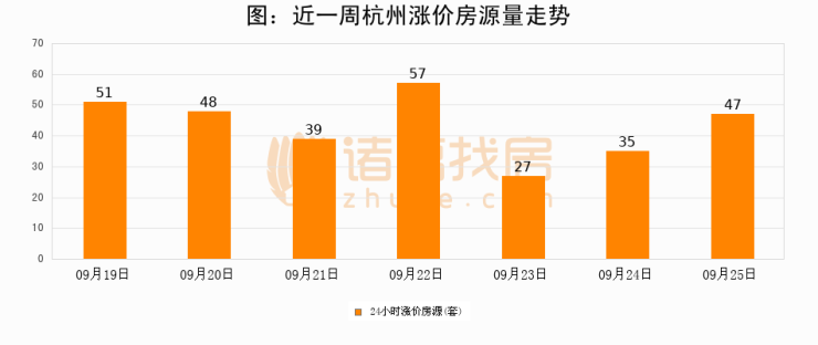 根据诸葛找房数据显示,杭州24小时涨价房源量为47套,较09月24日增加12套,环比上涨34.3%。与此同时,涨价房源占比小幅扩大,业主信心有所提升。