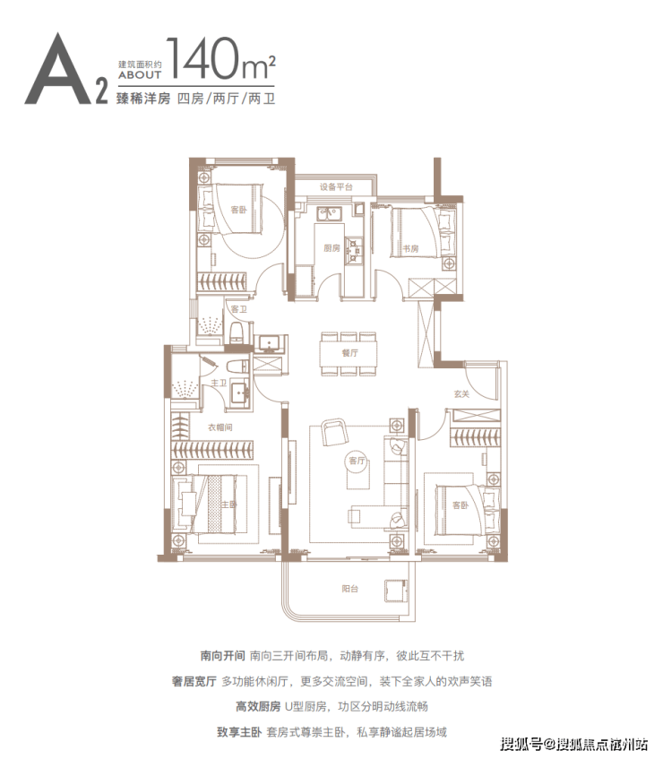 独立玄关、U型厨房、主卧大套间、三开间朝南大面宽等均为标配,堪称140㎡段的“完美四房”。