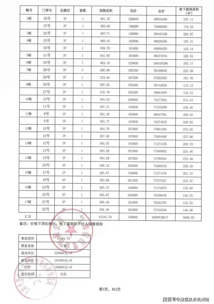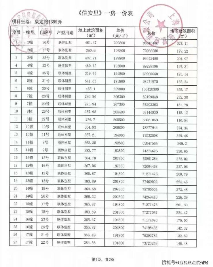 风貌别墅一房一价表: