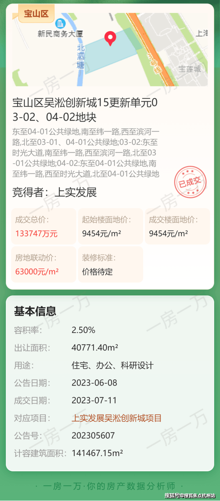 2023年7月11日,上海第二批次2轮土拍中,上实以总价133747万元成交宝山区吴淞创新城15更新单元03-02、04-02地块,地块出让面积40771.4㎡,容积率03-02:2.5;04-02:4.0。溢价率0%,楼板价9454元/㎡,房地联动价63000元/㎡。
