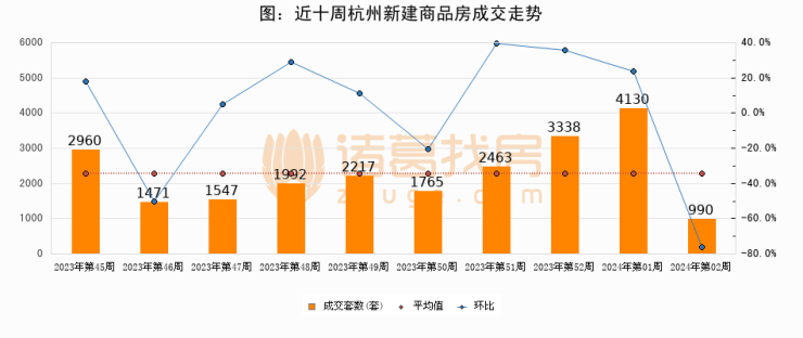 进入2024年第01周(01月01日-01月07日),杭州新建商品房成交990套,较上周减少3140套,环比下降76%