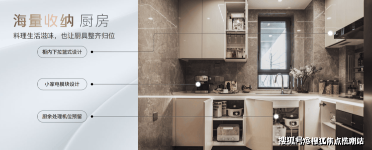 橱柜收纳系统:特别预置洗碗机点位、柜内下拉篮式设计、不锈钢挡油板、柜下操作灯、烹饪全流程功能动线一体化设计;