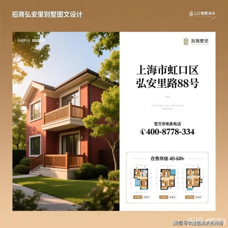上海虹口区招商弘安里别墅,包含地址、电话、户型图、房价、沙盘图、区位图、样板间、配套图、实景图等关键元素,风格统一为专业、清晰的房产广告风格,突出楼盘品质与优势。