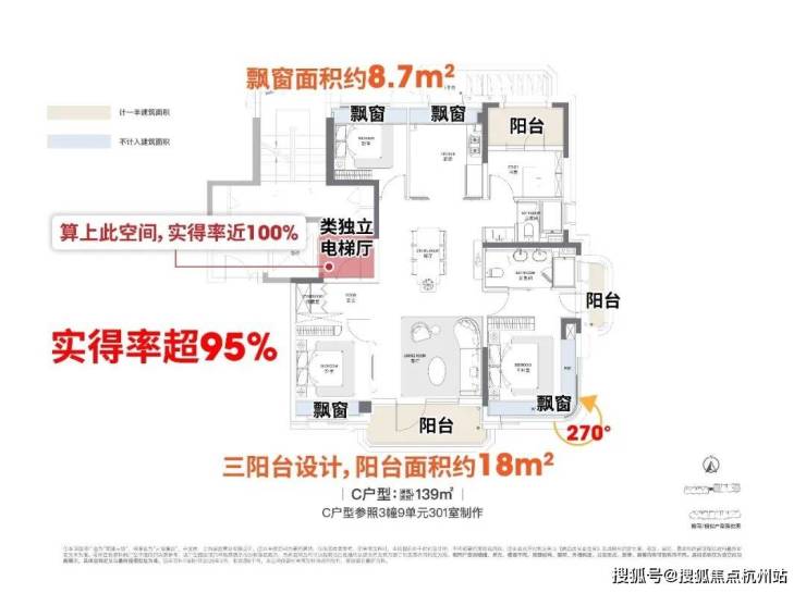 建面约139㎡C户型同样惊艳,采用 三阳台设计,阳台面积约18㎡,飘窗面积约8.7㎡,实得面积约133㎡, 实得率同样突破95%。