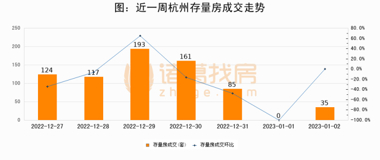 从存量房来看,2023年01月02日杭州存量房单日成交35套,比昨日增加35套,环比上涨0%。从近一周存量房成交来看,杭州存量房日均成交套数为102套,其中12月29日成交量最高为193套,01月02日单日成交35套,低于近一周平均水平65.7%。