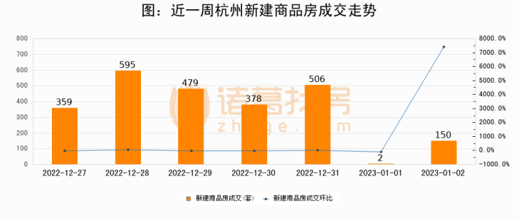根据杭州市住房保障和房产管理局数据显示,2023年01月02日杭州新建商品房成交150套,较昨日增加148套,环比上涨7400%。近一周杭州新建商品房日均成交353套,其中,12月28日成交量最高为595套。01月02日单日成交150套,低于近一周平均水平57.5%。
