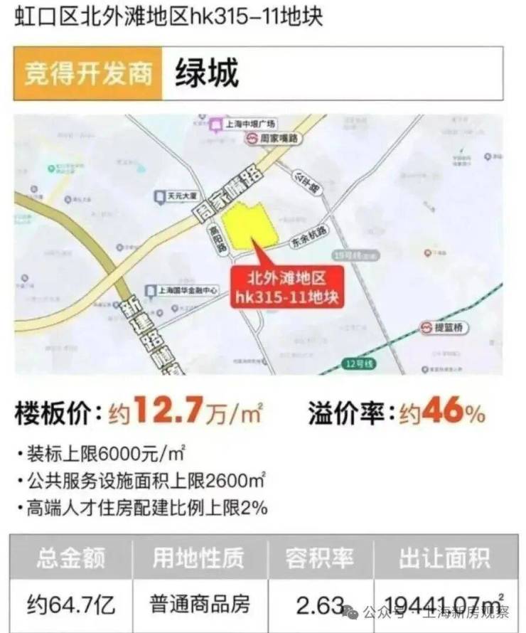 该地块在7月25日举行的上海第六轮土拍中, 绿城以总价64.72亿竞得 ;