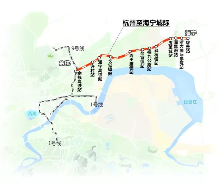 杭海城际铁路线路全长约48.1公里、共设车站13座(碧云站缓建)、与杭州地铁9号线换乘。杭海城际铁路建设完成后,较高运行时速将达到120公里/小时,打造融杭“一小时通勤圈”。