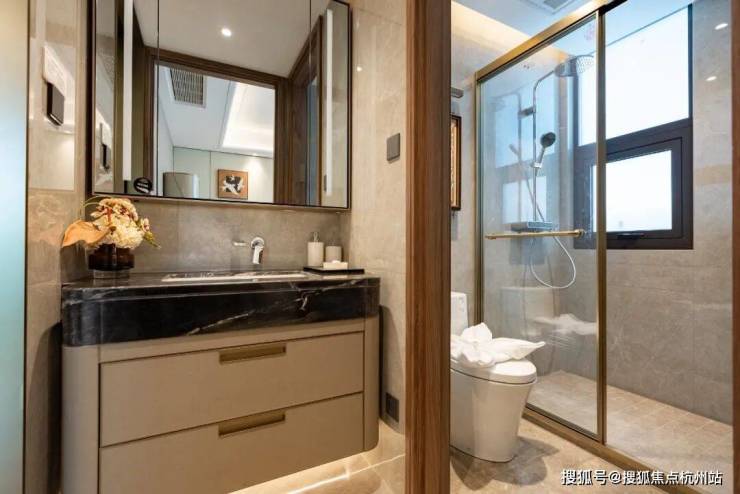 更有众多人性化细节,包括加热毛巾架,淋浴屏,定制台盆柜+镜柜等,省去后期定制比价的烦恼。