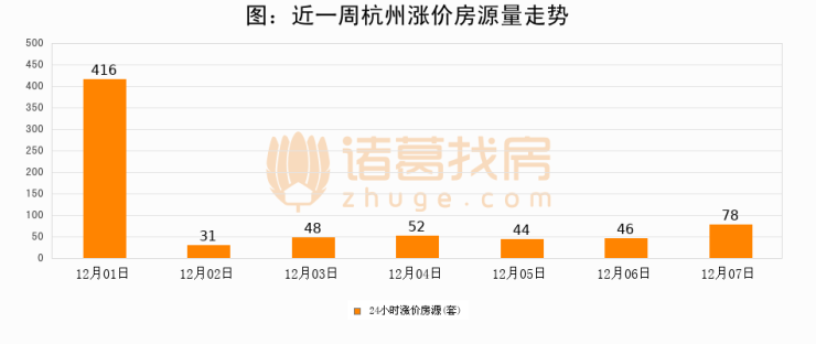 根据诸葛找房数据显示,杭州24小时涨价房源量为78套,较12月06日增加32套,环比上涨69.6%。与此同时,涨价房源占比小幅扩大,业主信心有所提升。