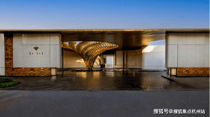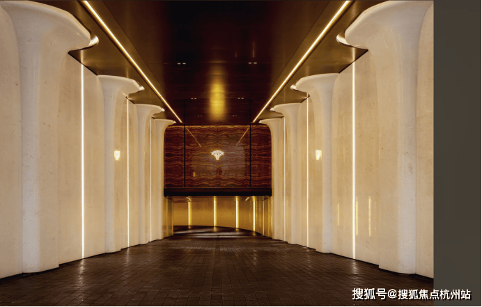 门庭延街的外立面,以精工定制弧形 米色石材 为主调,镶嵌典藏级 老虎玉大理石 ,点缀 古铜色现代海派艺术感灯器,整体呈现出百年海派的贵雅气质。
