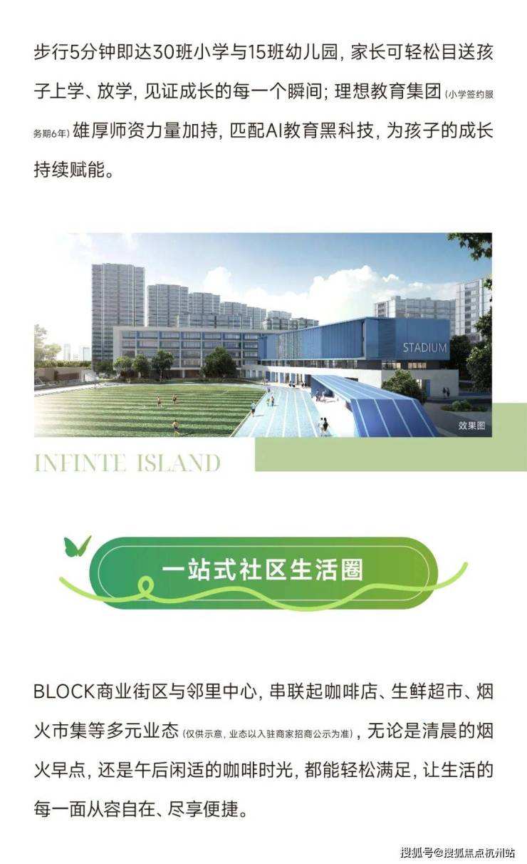 项目自带15 班幼儿园 + 36 班小学(公立,已建成),家门口一站式教育