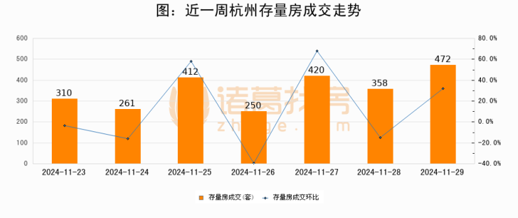 从存量房来看,2024年11月29日杭州存量房单日成交472套,比昨日增加114套,环比上涨31.8%。从近一周存量房成交来看,杭州存量房日均成交套数为354套,11月29日单日成交472套,高于近一周平均水平33.3%。