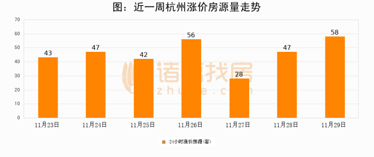 根据诸葛找房数据显示,杭州24小时涨价房源量为58套,较11月28日增加11套,环比上涨23.4%。与此同时,涨价房源占比小幅扩大,业主信心有所提升。