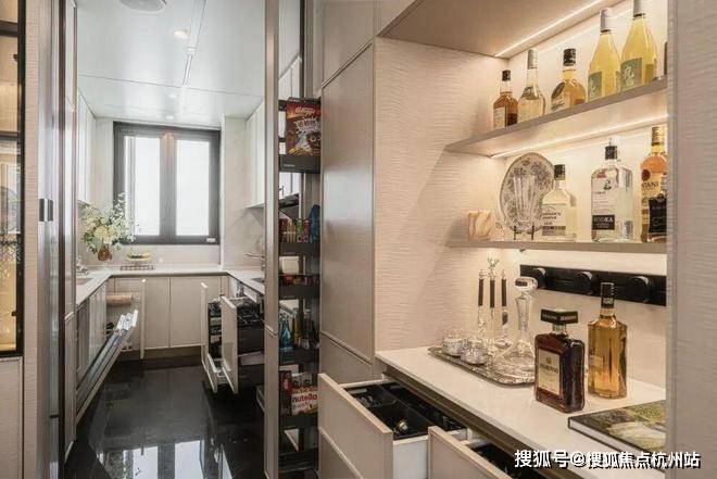 当下比较热门的横厅布局,横厅尺度达6.1米,层高3.15米,同样尺度奢阔。想象一下,家庭小型聚会,一边在大横厅里面和朋友畅聊,一边给友人煮咖啡或烤面包,生活场景丰富多姿。