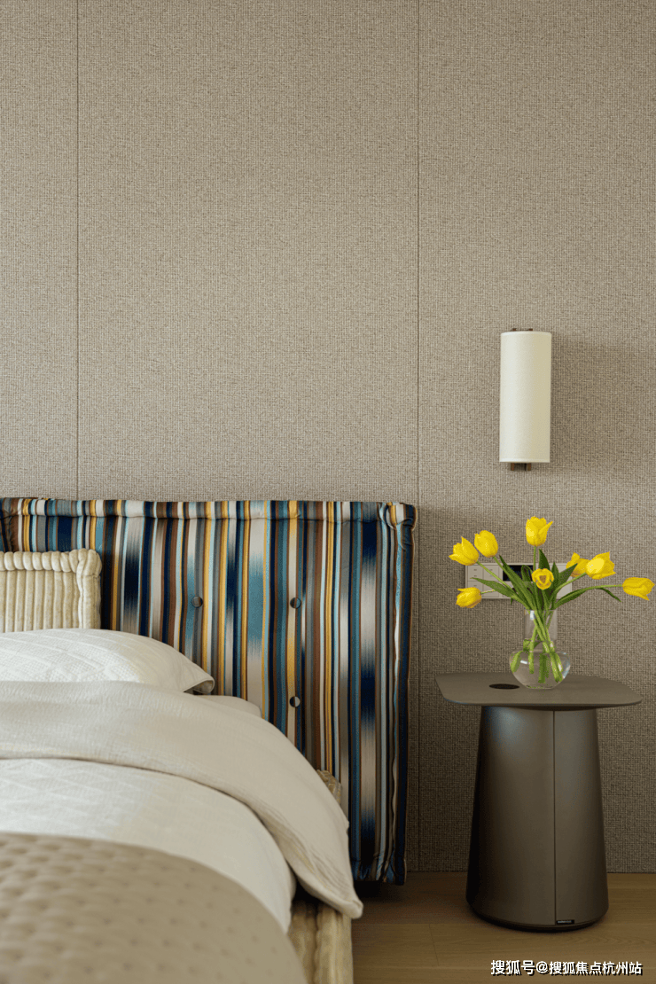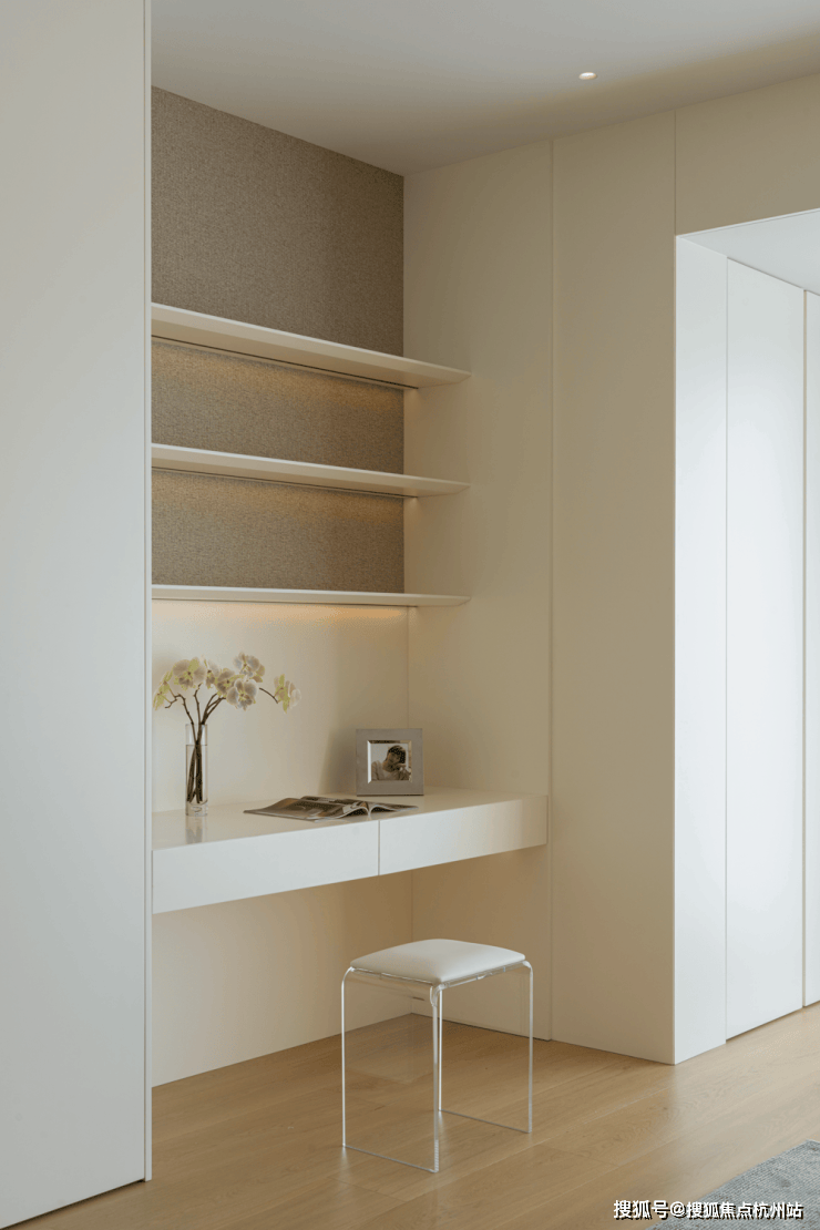 作为入户第一幕,玄关以极简姿态开启生活叙事,素净墙面如天然画布。清透支架托举着素白花瓶,植物姿态俏皮延展,成为连接户外与生活的温柔过渡。