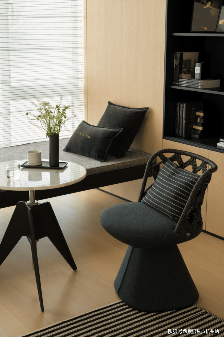 中央的B&B Camaleonda模块组合沙发,以岛状布局重构空间逻辑,双向陈设的低椅背设计。一面朝向书柜电视墙,一面衔接餐厨区。让场景切换随心意而生,既保持空间通透感,又以功能分区提升使用效率。