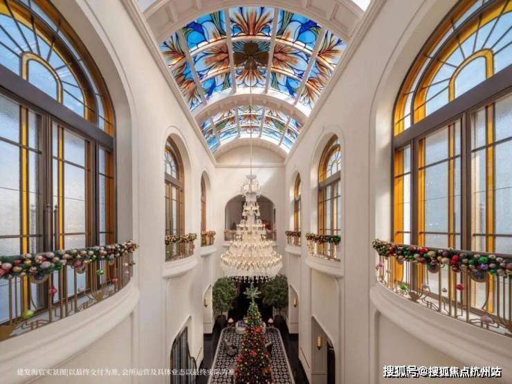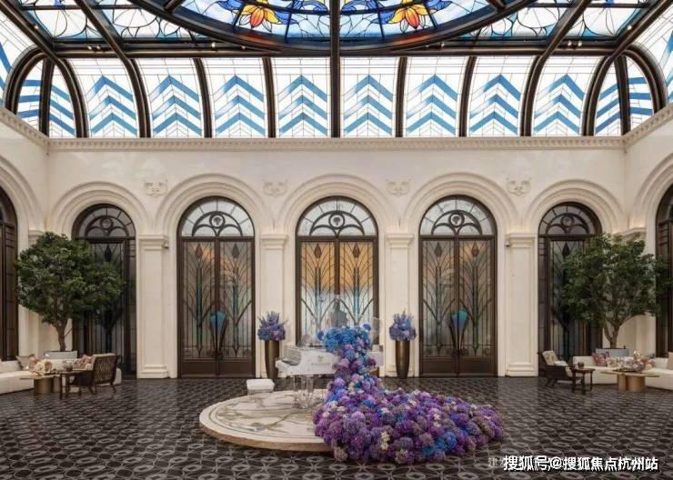 「华亭烟雨」造设波光喷泉与孔雀雕塑,八株紫玉兰盛绽其间,将自然之力凝聚为艺术语言;「千步廊」汲取和平饭店的设计灵感,地面通铺同款“金珠算盘”,并融入绒绣、顾绣、海派玉雕等“上海非遗十绝”,将海派东方的摩登风韵尽致演绎;「孔雀厅」同源上海华尔道夫酒店精髓,约14米挑高宏阔大堂,开阔奢华,穹顶巨幕彩绘玻璃,历经团队三轮打样,终成绮丽之景。