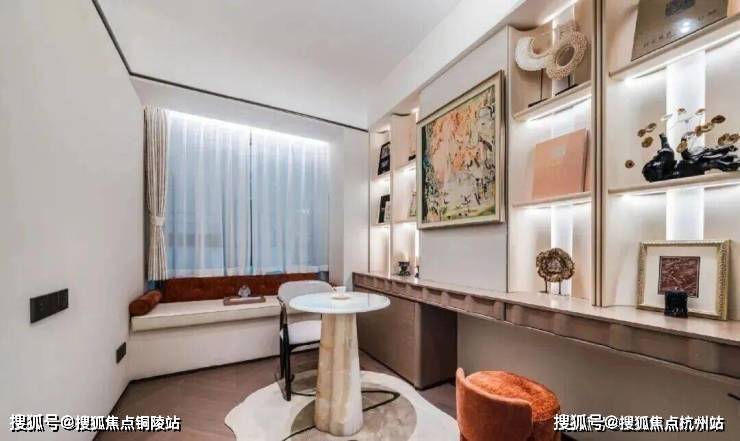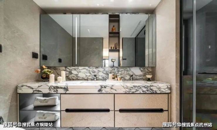 另外采用意大利“大花白”天然石材实现地墙满铺,双台盆与双镜柜的对称设计复刻五星酒店规制,美妆冰箱精准控温呵护护肤品,奢华至极!