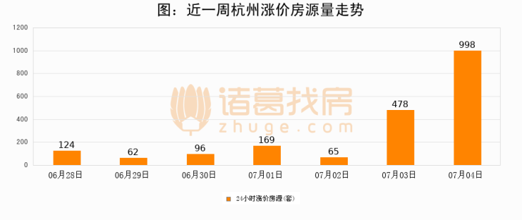 根据诸葛找房数据显示,杭州24小时涨价房源量为998套,较07月03日增加520套,环比上涨108.8%。与此同时,涨价房源占比小幅扩大,业主信心有所提升。