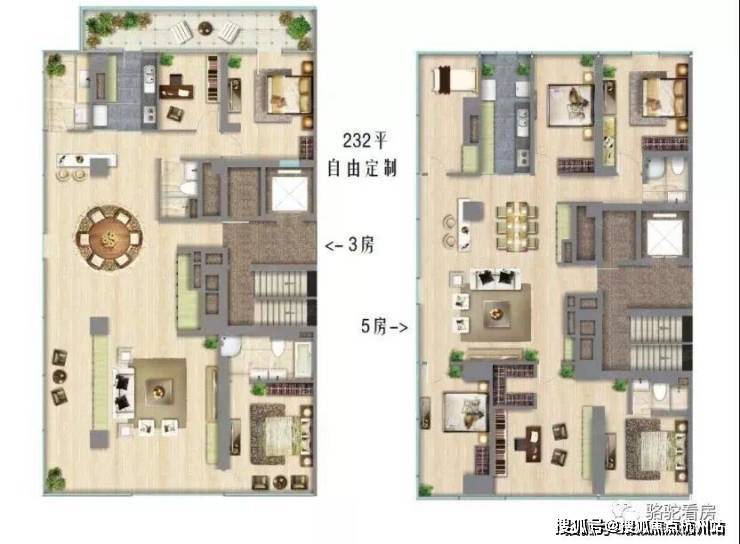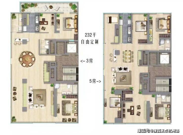 以232㎡面积产品为例,既可以做成3房也可以做成5房甚至大平层2房1房,全看 用户灵活定制要求。