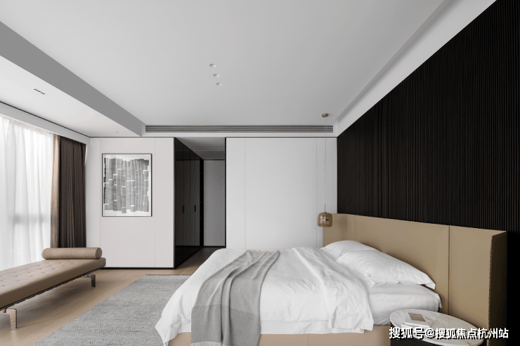 私密场域依旧保持静谧,黑白色基础上搭配了更多的色彩,例如深棕、浅紫等,艺术品的衬托深邃迷人,热络了家的氛围。