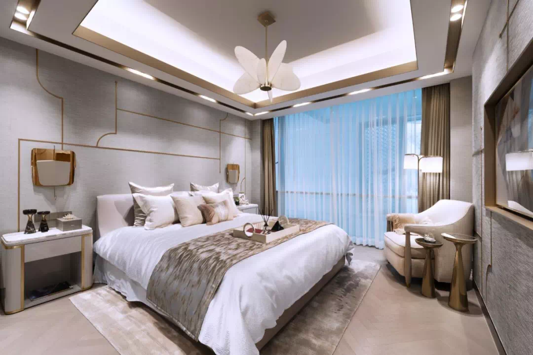 举一个最简单的例子吧。这是一套凤起潮鸣的223㎡的高层样板房主卧,你或许并不会留意到墙上的铜色线条,只会觉得赏心悦目。这些几何图形有什么功能?完全没有。但是有了它们,呆板的墙面瞬间就活了过来,有了表情甚至温度。
