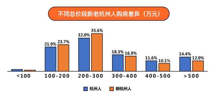 同时,已购房的新杭州人整体呈现年轻化特征,21-30岁之间购房占比最多,占比达到 62.4%,新一代的年轻人买房意识更加超前,当然买房时间提前了,购买力方面就要“缩减”一些。新杭州人购房支付力以300万为分水岭,高于300万以上,购房比例低于杭州人,低于300万则高于杭州人(100万以下除外)。