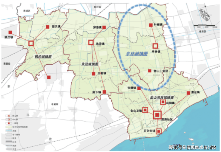 与奉贤、松江两区是邻居,到城央的直线距离,可以类比松江新城与奉贤新城。尤其是金山亭林,作为更靠近城央的地区之一,更有着先天的地理优势。