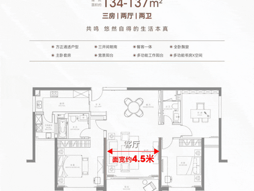 B1 户型|133㎡ 2 室 2 厅 2 卫:南北通透,双南卧室,主卧套间带独立卫浴 + 衣帽间,餐客通厅约 4.5 米面宽,全明采光,适合精英两口 / 三口之家。