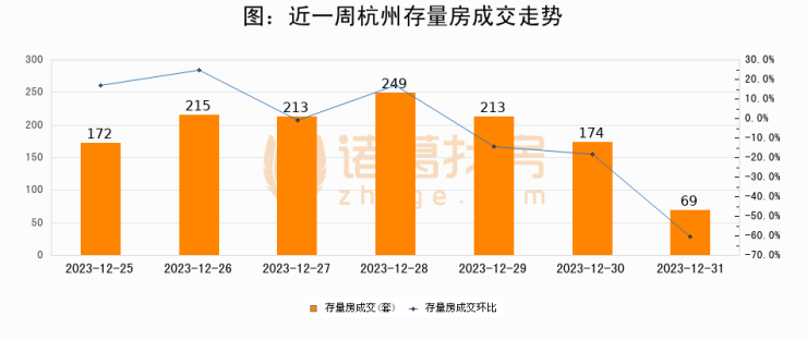 从存量房来看,2023年12月31日杭州存量房单日成交69套,比昨日减少105套,环比下降60.3%。从近一周存量房成交来看,杭州存量房日均成交套数为186套,12月31日单日成交69套,低于近一周平均水平62.9%。