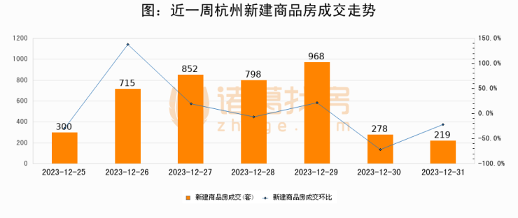 根据杭州市住房保障和房产管理局数据显示,2023年12月31日杭州新建商品房成交219套,较昨日减少59套,环比下降21.2%