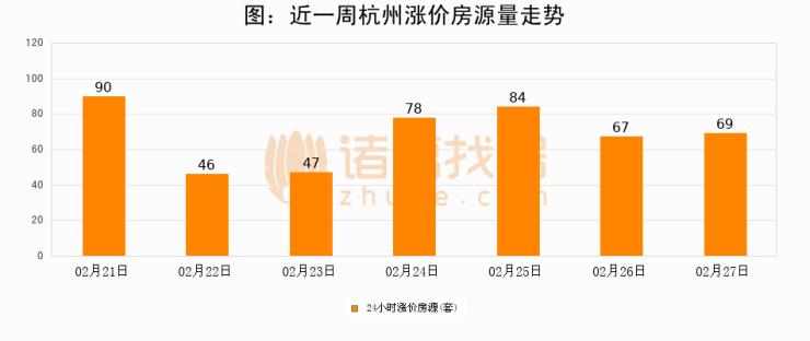 根据诸葛找房数据显示,杭州24小时涨价房源量为69套,较02月26日增加2套,环比上涨3%。与此同时,涨价房源占比小幅扩大,业主信心有所提升。