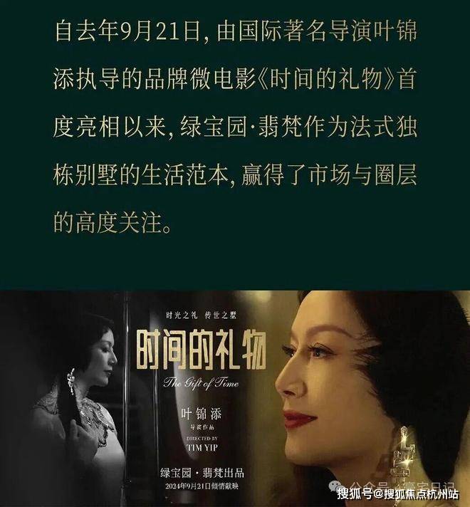 2024年,微电影《时间的礼物》首映,这部由奥斯卡得主叶锦添执导的大片,以其独特的艺术视角和非凡的艺术品位,深度诠释了“中国十大超级豪宅”之一『绿宝园·翡梵』的生活理念,为地产界艺术风潮注入新的活力,重新定义了豪宅的价值内涵。
