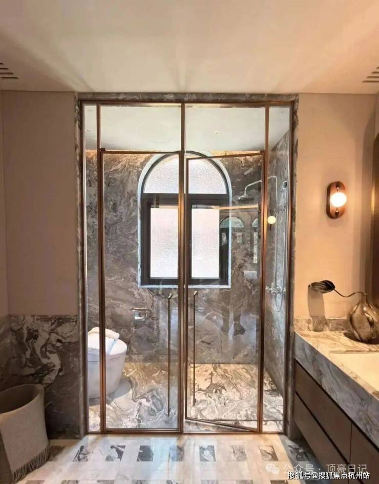 建筑基层石材选用近拟传统皇家建筑所用金山石的世贸金麻,经手工凿毛、酸洗做旧处理,搭配铜质落水管、水纹压花玻璃,每一处细节都在诉说海派大宅的优雅与贵重。
