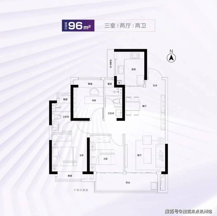 建面约95、96㎡室内拥有双开间大尺度阳台、全屋四处飘窗、套房式主卧,舒适度颇高。