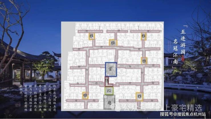 园内布局五进制南北主轴、以及“双龙戏水”格局的双水街,巷道联通,设七大景观组团,形成“一环、两轴、七境”布局。175席中式园宅,依巷分布南北,横平竖直,秩序井然。