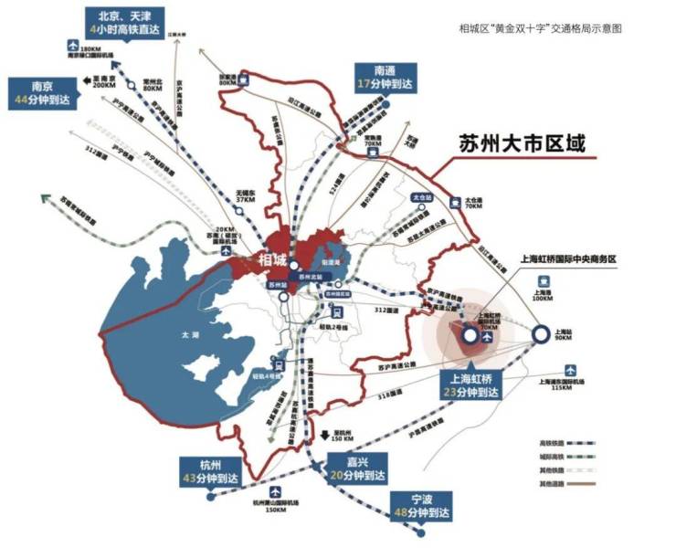 【黄金“双十字” 国家级高铁枢纽】通苏嘉甬高铁与京沪高铁、如通苏湖与苏锡常城铁将于高铁新城交汇形成黄金“双十字”枢纽,实现苏州与虹桥枢纽、浦东枢纽、苏南硕放机场、禄口机场、萧山机场、以及规划南通机场一小时快速交通联系,更将加速高铁新城融入国家“八横八纵“铁路网。